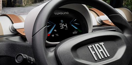 Topolino diventa anche più intuitiva con il suo nuovo quadro strumenti digitale, che passa da 3,5'' a 5,7'', con una superficie di visualizzazione completa di 8,3''. Il nuovo quadro strumenti digitale della Topolino introduce una grafica semplificata, una migliore leggibilità e un linguaggio visivo più leggero e intuitivo.